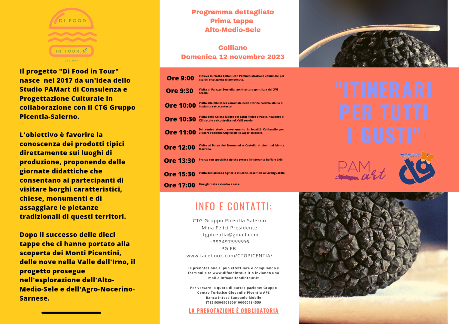 Per garantirsi la prenotazione, tassativamente entro venerdì 10 Novembre 2023 attraverso il sito www.difoodintour.it, bisogna compilare l’apposito modulo in questa pagina ed inviarlo.