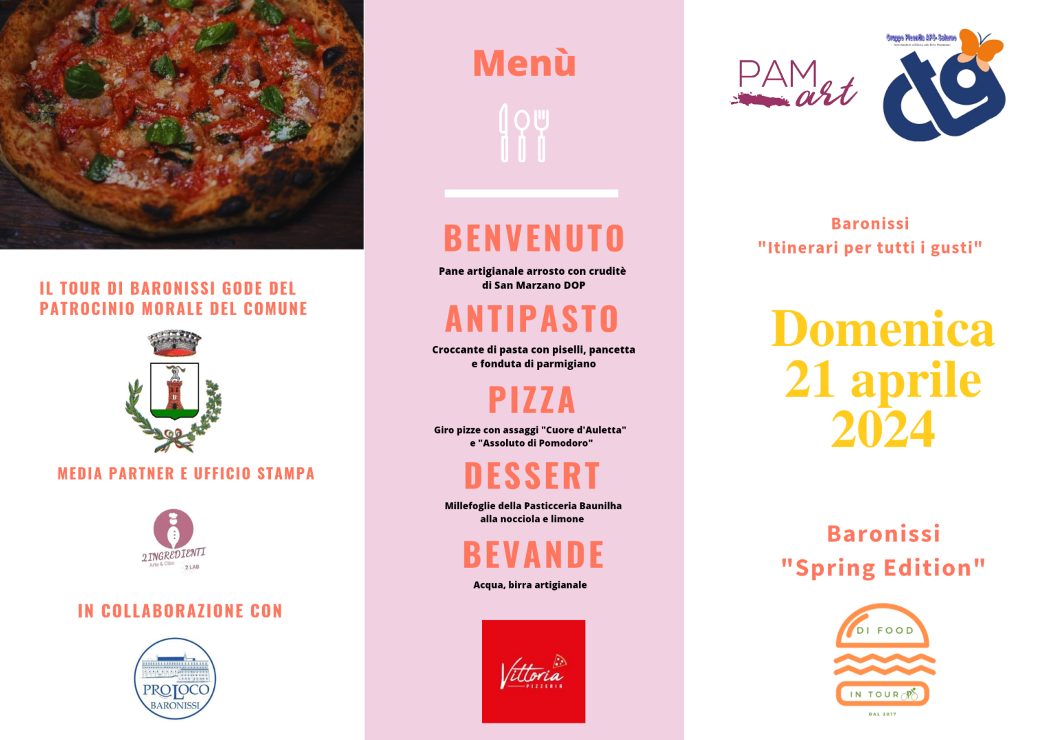 Domenica 21 aprile 2024 alle 9:30, dopo un caffè di benvenuto e i saluti istituzionali del Sindaco Gianfranco Valiante, i partecipanti inizieranno la visita di alcuni dei monumenti più rappresentativi di Baronissi assieme alla Pro Loco e ai suoi soci di cui la Presidente Maria Picarone che tanto si è attivata per l'organizzazione dell'itinerario culturale ed enogastronomico. La passeggiata culturale, che riempirà parte della mattinata, darà modo ai turisti di conoscere la cittadina con i suoi scorci più caratteristici come quelli di Casali con i suoi pannelli maiolicati, della Villa e del Palzzo Comunale, le Chiese di Montevergine e del Santissmo Salvatore. A seguire gli approfondimenti enogastronomici che da sempre hanno caratterizzato i tour, come la visita mattutina alla Cantina Guerritore, apprezzata per i suoi rinomati vini, e pomeridiana alla Pasticceria Baunilha di Stefania Fasano per assistere in diretta alla creazione dei suoi più rinomati dolci artigianali. Insieme si proseguirà per il pranzo presso la Pizzeria Vittoria di Sabatino Citro, dove il menù sarà a base di antipasto con prodotti selezionati, pizze territoriali e di stagione, dessert ideato in collaborazione con la Pasticceria Baunilha.