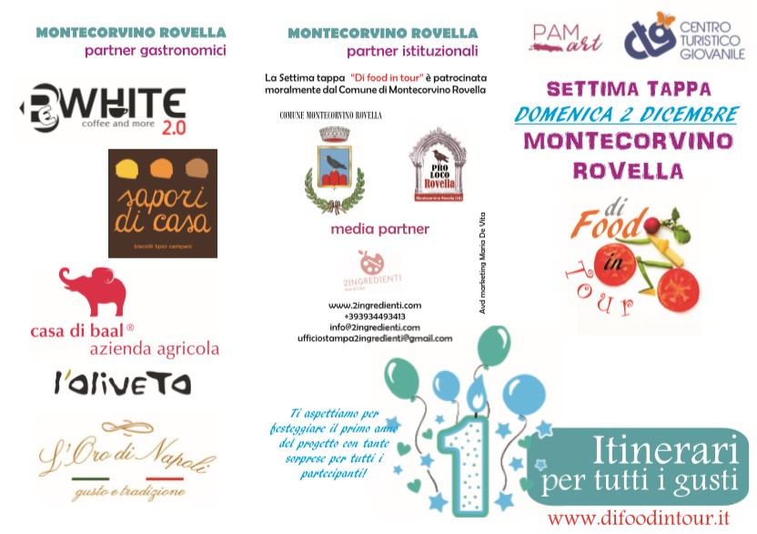 Happy Birthday Di Food in Tour. Domenica 2 dicembre il progetto festeggerà il suo primo anno di vita a Montecorvino Rovella. Settima Tappa per CTG Picentia Salerno e PAMart, ancora i Picentini sotto i riflettori per promuovere i beni culturali ed enogastronomici del territorio.